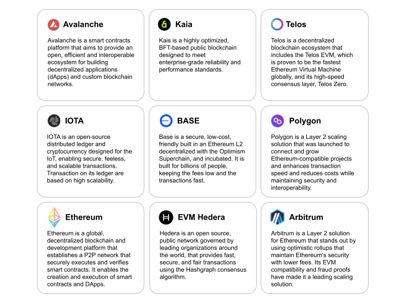 In general, we can support any EVM-compatible blockchain network. The following blockchains are already available and ready to use on our platform: